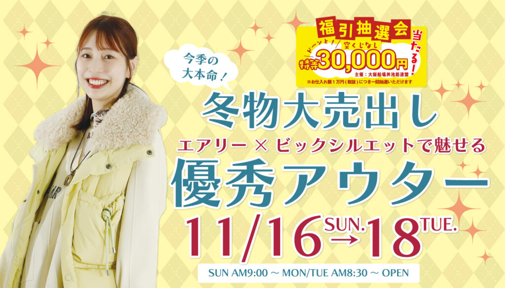 - 福引 冬物大売出し11/16~18 エアリー×ビックシルエットで魅せる 今季の… 続きを読む: 福引 冬物大売出し