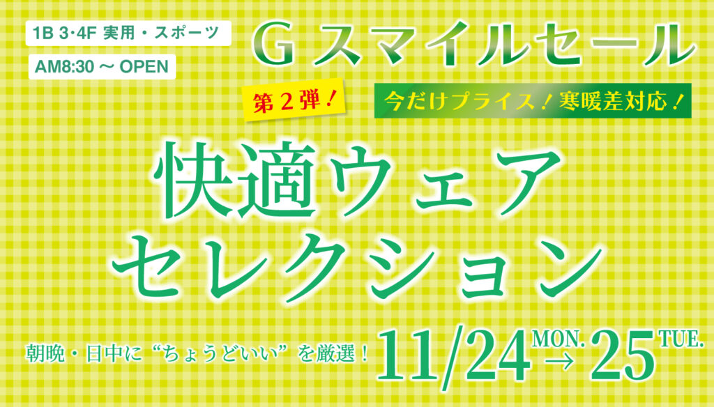 - 第2弾 Gスマイルセール11/24~25 今だけプライス!寒暖差対応! 快適ウェアセ… 続きを読む: 第2弾 Gスマイルセール