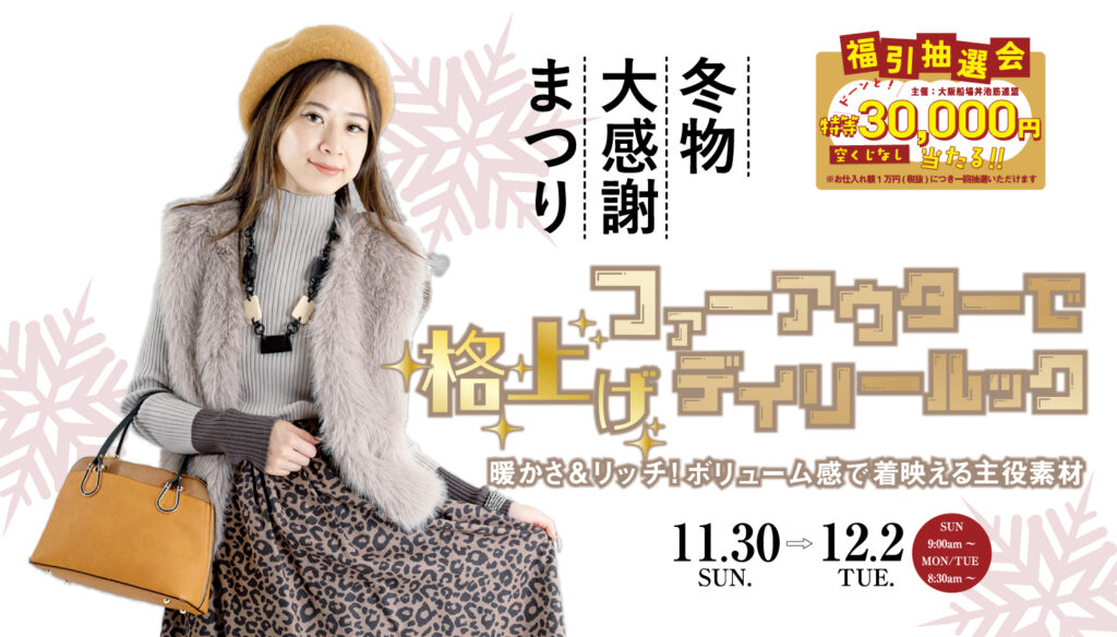 - 福引 冬物大感謝まつり11/30~12/2 ファーアウターで格上げデイリールック … 続きを読む: 福引 冬物大感謝まつり