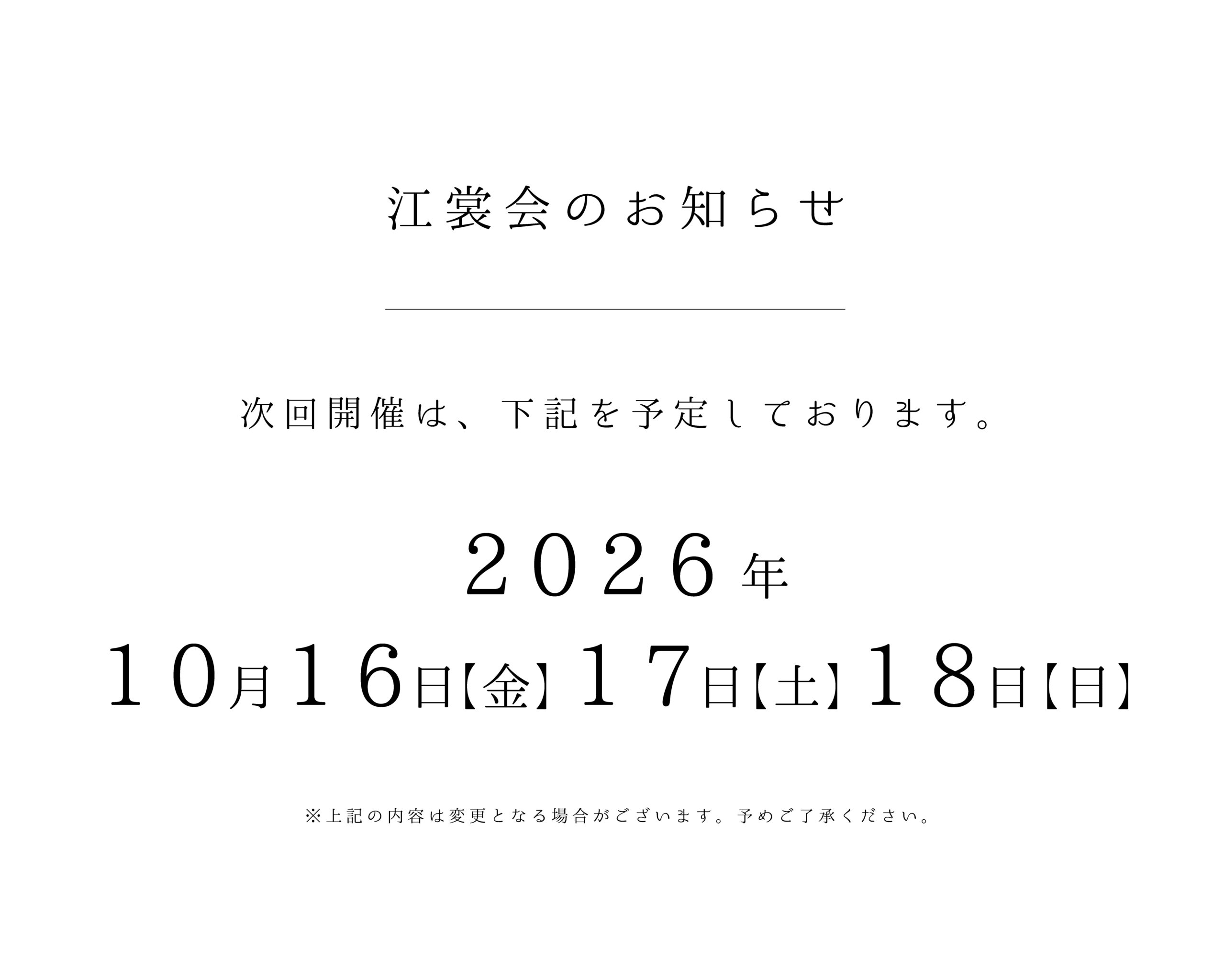 第29回江裳会 開催のお知らせ 2025年3月7日 最終更新日時 : 2026年4月13日 gomen.pop 開催期間:10月16日(金)17日(土)18日(日) 時間:午前10時 ~ 午後5時 場所:江綿第1ビル 7階特設会場