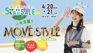4月20~21日 全館・全品5%還元セール 今季注目! MOVE STYLE 多彩に魅せる3つの着こなし提案! 売出し内容 Pick Up コーナー&イベント 体験会